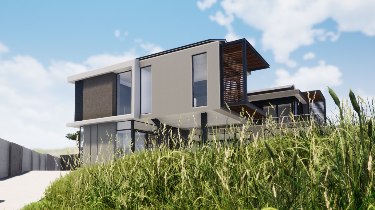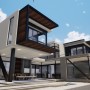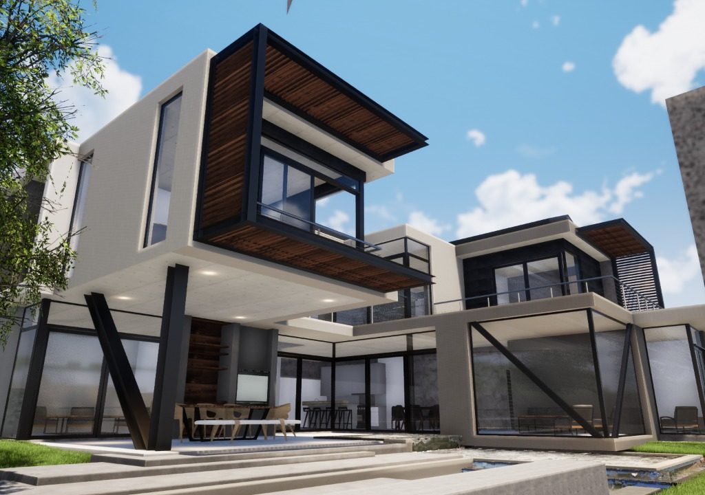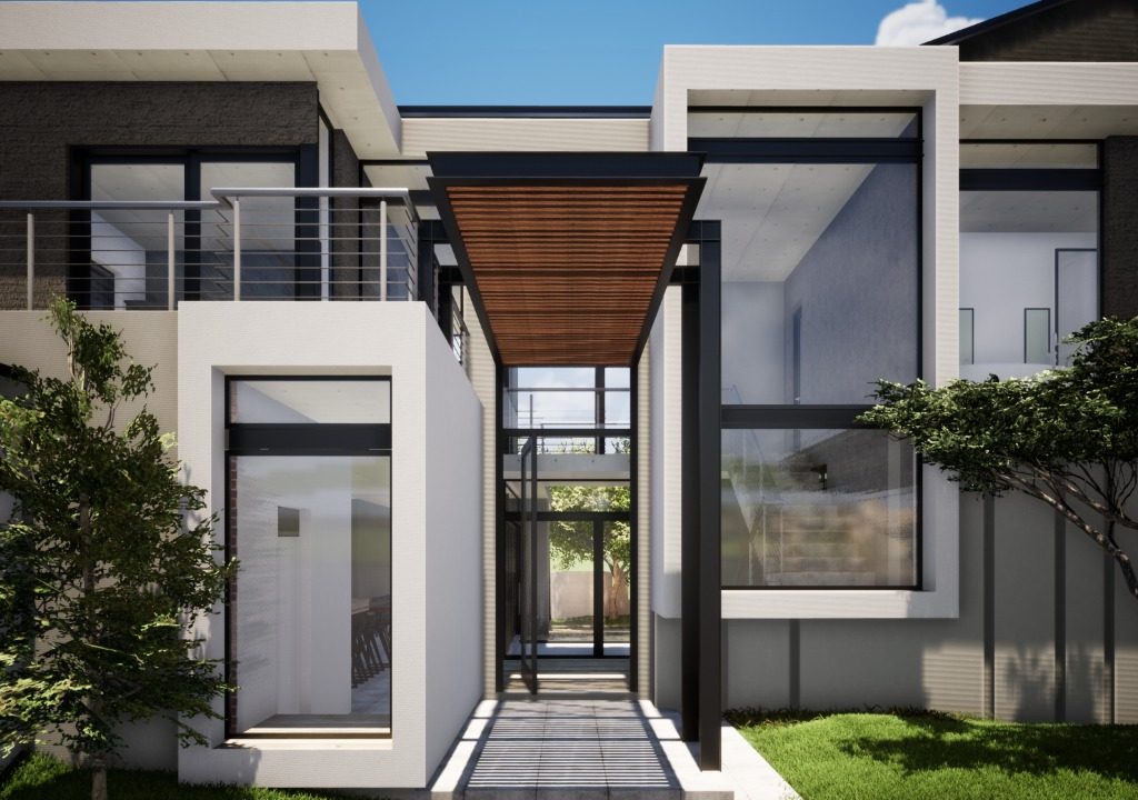 - Feature lighting, textured cladding, and steel accents